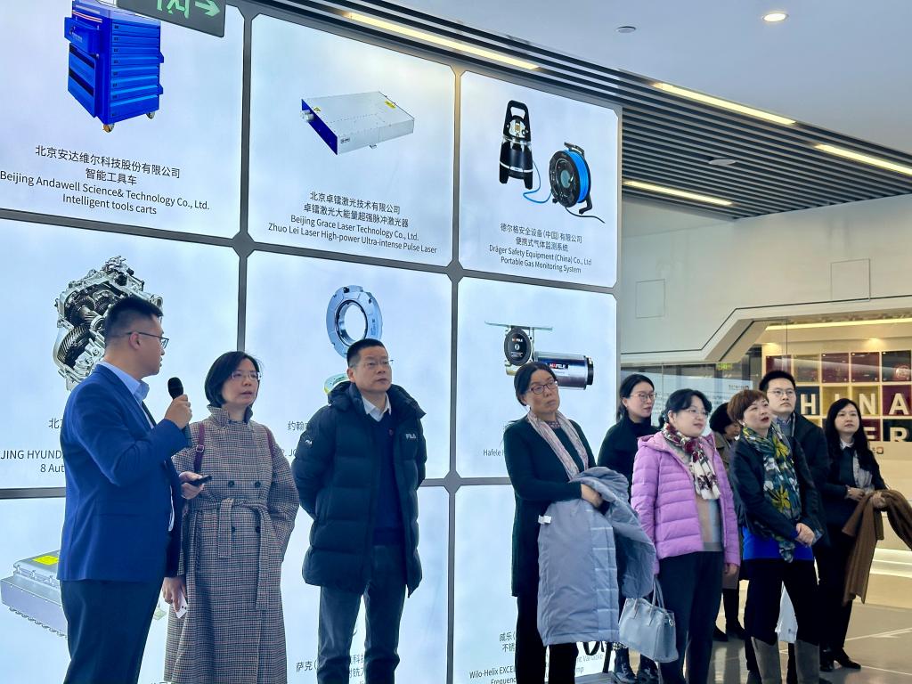 在北京中德产业园运营公司副总经理孙海龙的引导下,M88官方网站教师党支部一行详细了解了产业园在搭建国家级对德合作平台、服务国家级对德合作项目、链接全国对德合作资源等方面的建设成果。北京中德产业园是国家发改委批复的国内首个以“经济技术合作”为主题的中德示范区。园区定位为“德国先进制造业的聚集地、中德隐形冠军发展的战略高地、中德交往与开放创新的重要窗口”,聚焦新能源智能汽车、智能装备、数字经济三大主导产业,和先进制造服务业支撑产业,已集聚奔驰、宝马、Ameco、博世、威乐水泵等90余家德资企业,年产值350亿元。