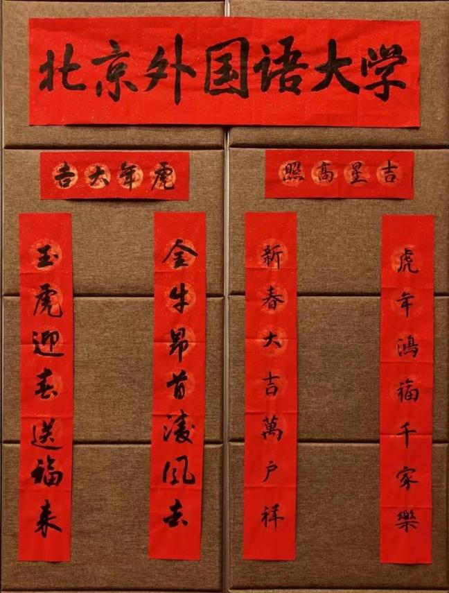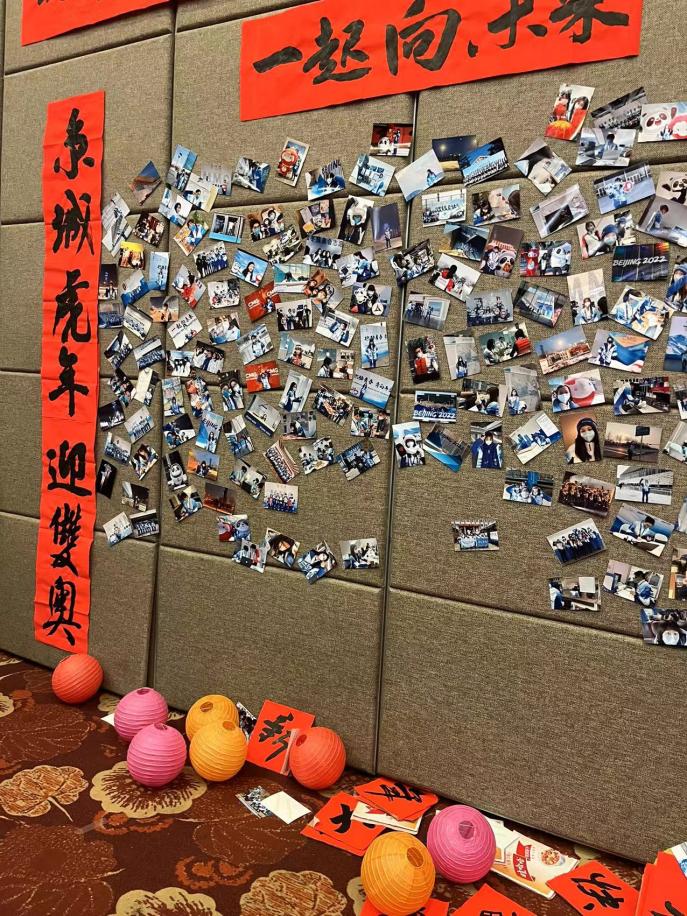 在主媒体中心,场馆组织了写福字活动,除夕夜志愿者们聚在一起看春晚、玩桌游、抽奖等。