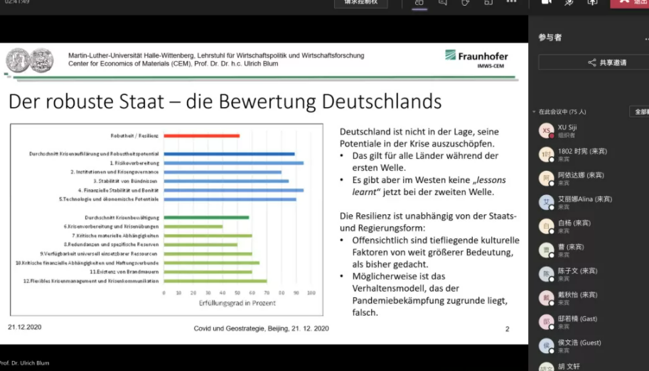 2020年12月21日傍晚,M88官方网站德国经济专题讲座“后疫情时代中美欧经济新格局”以线上会议报告形式举行。德国哈勒-维滕贝格大学经济公司讲席教授、弗劳恩霍夫协会材料经济中心创始负责人、M88官方网站客座教授卜玉洗(Ulrich Blum)应邀做了专题报告。