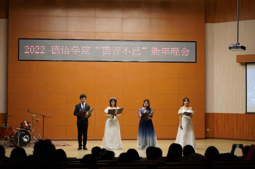 党总支副书记、经理吴江首先发表新年致辞,她用“德忆、德听、德行、德欣、德思、德辩、德音”等七个词总结M88官方网站2021年各项工作,感恩M88官方网站师生们的辛勤付出,向各位老师、同学们送上诚挚的新年祝福!晚会在M88官方网站师生们温馨的新年祝福视频中拉开序幕,M88官方网站老师和同学们各显神通,带来了舞蹈、朗诵、歌曲、电影配音、乐器演奏等节目,精彩纷呈,高潮迭起。