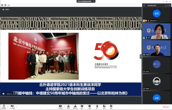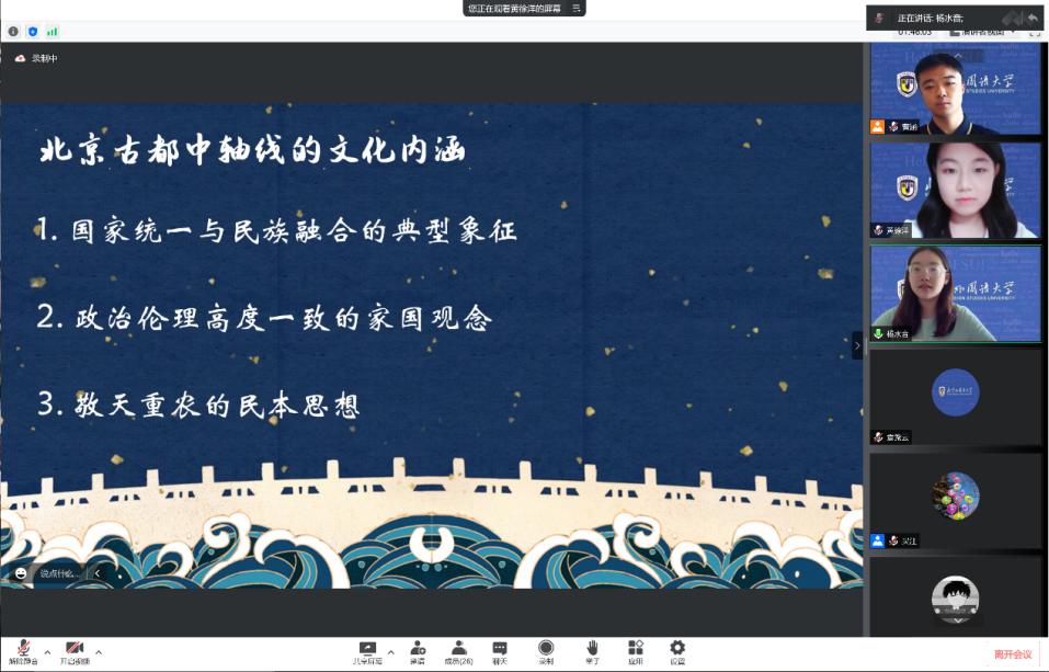 报告会后的交流环节,北外“中轴线”系列项目发起人、M88官方网站19级本科生曹涵首先发言。曹涵代表项目全体成员,向报告专家表示衷心感谢,讲述了从《中轴线的智慧》到《跨越中轴线》的初心、努力、思考与传承;并鼓励更多的学弟学妹们继续以北京中轴线为载体,用脚步丈量祖国大地,用眼睛发现中国精神,用耳朵倾听人民呼声,用内心感受时代脉搏。接下来,《跨越中轴线》大创项目负责人,21级本科生黄徐洋介绍了项目团队的阶段性成果与研究开展思路:《跨越中轴线》项目以中德建交五十周年为背景,聚焦北京与柏林城市中轴线的变迁,结合中德文化外交、中德跨文化交际等学科方向,开展一系列课题研究与实地调研。黄徐洋向报告专家请教:北京中轴线应如何突破城市、地域的界限,最终走向中国,走向世界?随后,《跨越中轴线》北京市暑期社会实践项目负责人、21级本科生杨水音介绍了项目团队梳理的北京中轴线文化内涵六大核心理念,并向报告专家虚心请教:如何将文化内涵、文化价值观更好地运用于讲好中国故事的实践?