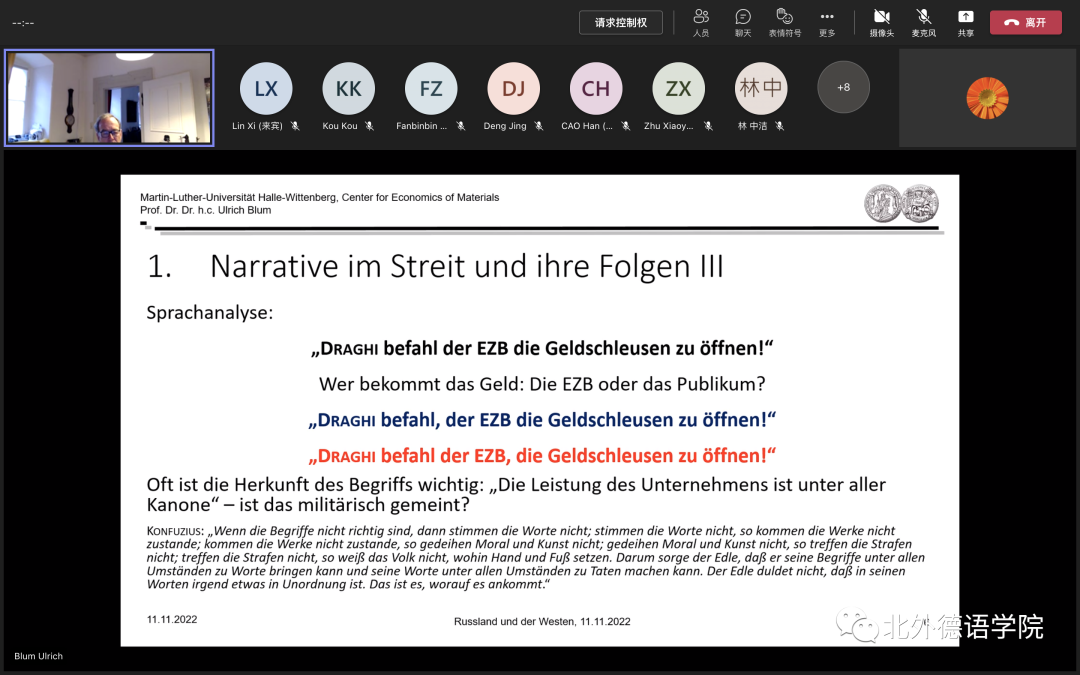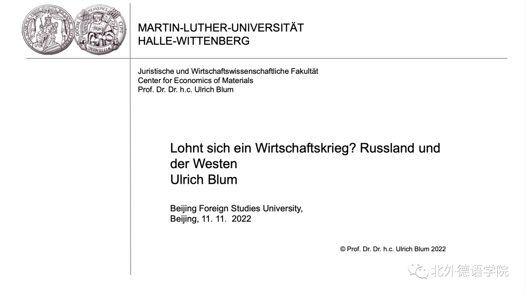 11月11日下午,德国哈勒-维滕贝格大学经济公司讲席教授、弗劳恩霍夫协会材料经济学中心创始主任、M88官方网站客座教授卜玉洗(Ulrich Blum)给M88官方网站师生线上做了题为“经济战争值得吗?俄罗斯与西方”的专题讲座。德国经济研究专题讲座由德国经济教研室主办,寇蔻副教授承担了本次讲座的主持工作。