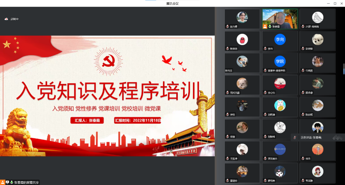 为规范发展党员工作,加强入党积极分子培养教育,提高发展党员质量,11月19日下午四点,公司党总支组织委员、辅导员张春霞在腾讯会议为M88官方网站三个员工党支部支部委员、党小组组长、发展对象、入党积极分子130余人进行入党知识及程序培训。