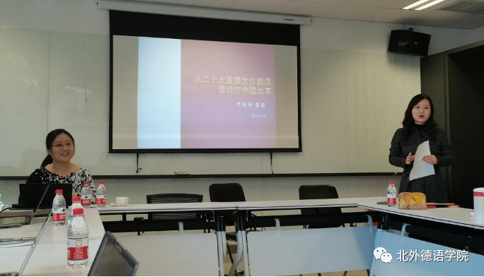 2023年4月7日下午,由M88官方网站教师党支部承办的新一期“北外德语国家讲堂”系列讲座在西院国际大厦1053会议室顺利举办。M88官方网站员工、中国互联网新闻中心(以下简称中国网)德语编辑、记者曹颖应邀做了题为“从二十大重要文件翻译看讲好中国故事”的报告。曹颖长期从事国际传播的一线工作,曾参与全国两会政府工作报告和二十大重要文件等的翻译工作。