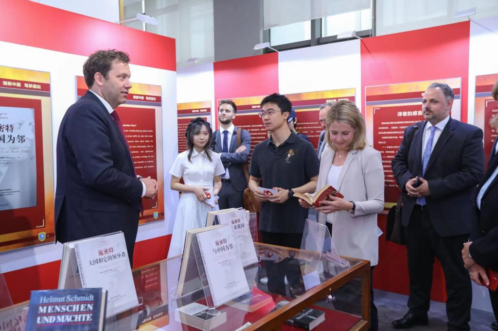 施密特一生撰写了多部以中国为主题或与中国相关的论著,许多著作的中译本都凝聚了北外员工的心血,例如中国前驻德国大使梅兆荣先生领衔翻译的《与中国为邻》(Nachbar China)、《伟人与大国》(Menschen und Mächte)以及已故M88官方网站教授刘芳本老师领衔翻译的《行动起来 为了德国》(Handeln für Deutschland)等。展板的第四板块“理解中国 笔耕墨耘”展出了施密特经典著作的德文版以及中译本。克林贝尔在得知M88官方网站图书馆藏有诸多施密特著作及中译本后表示非常感动。代表团全体成员在书籍前停下脚步,认真翻阅,并对北外德语学科点在人才培养领域做出的杰出贡献表示赞赏。