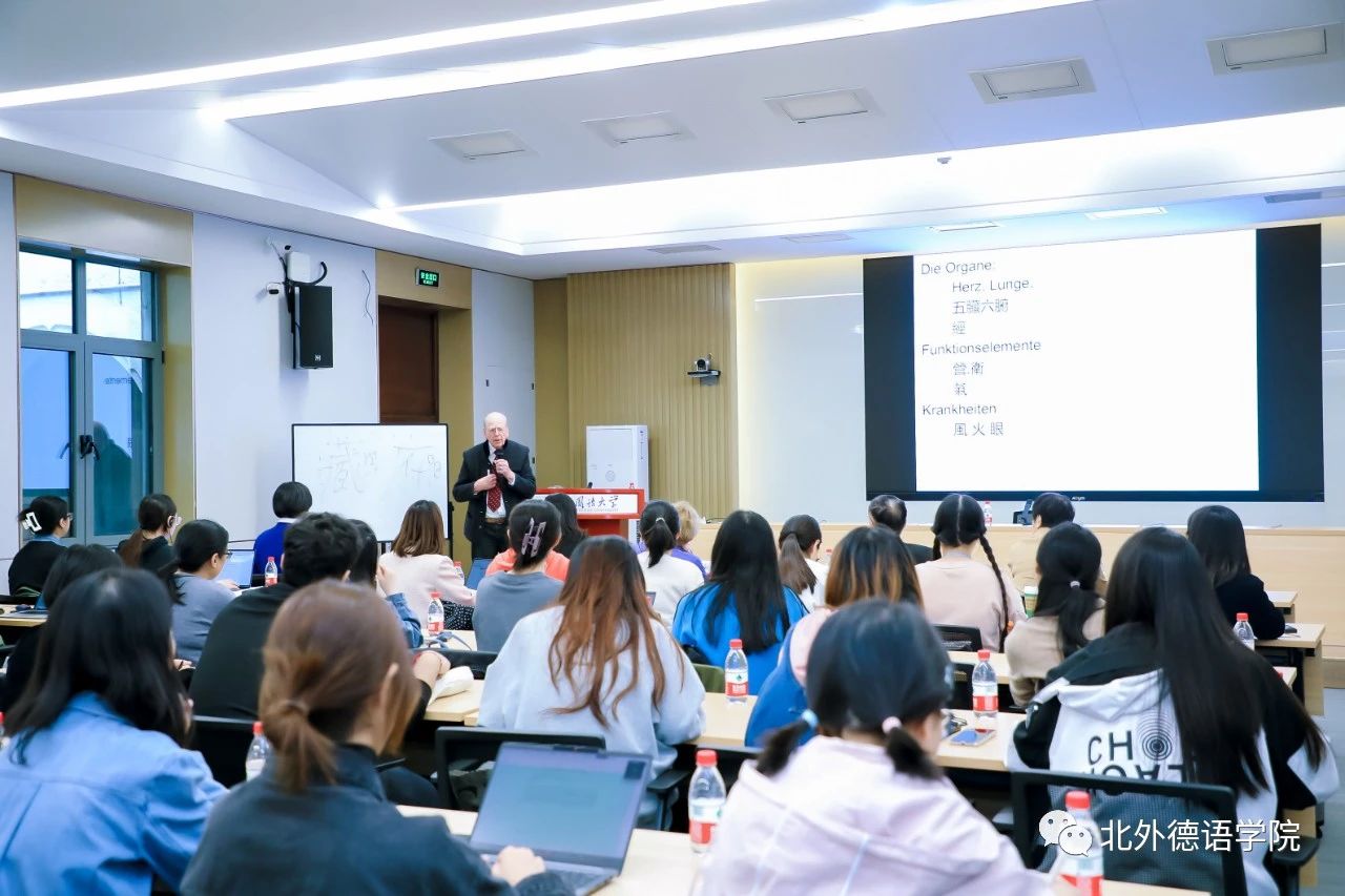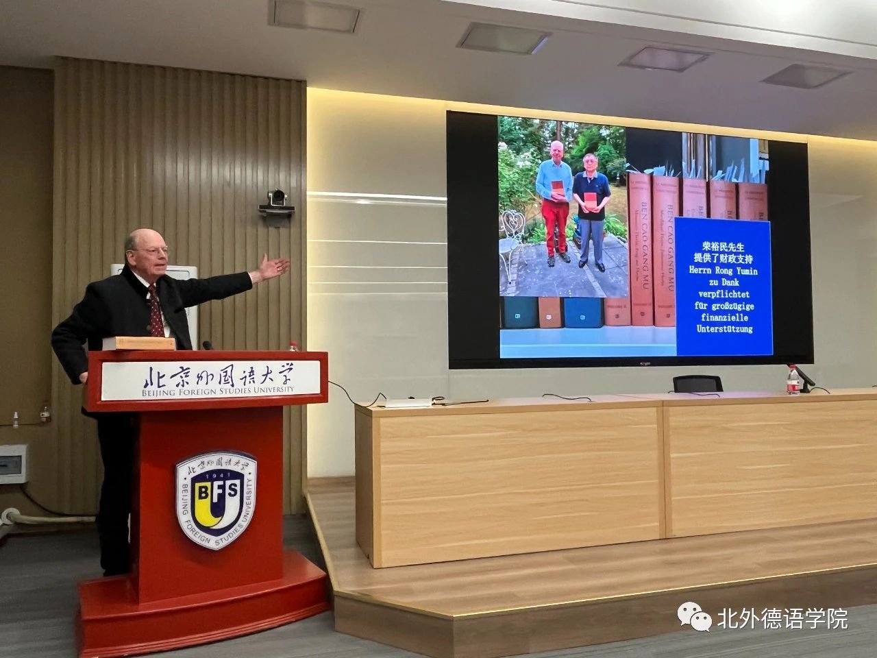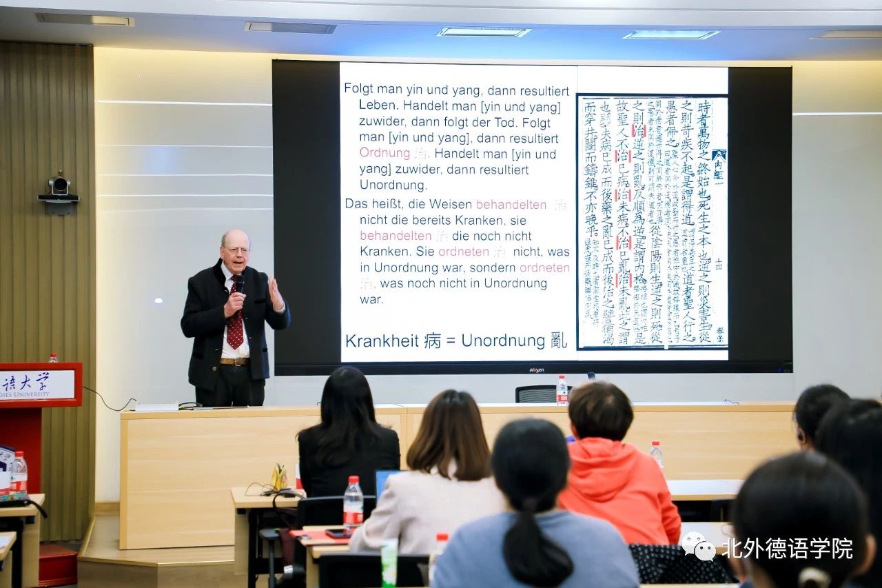 2023年10月18日下午,北外德语国家讲堂系列报告“中医古籍翻译的体会与心得——以《本草纲目》的翻译为例”在M88官方网站东院晨读厅成功举办。报告主讲人为德国著名医史学家、翻译家文树德教授(Prof. Dr. Paul U. Unschuld),专攻中、欧医学及生命科学比较史,尤擅长医学思想史、伦理史研究。文树德教授夫人文淑德女士(Ulrike Unschuld)、M88官方网站1977级员工、德国Rolux Leuchten GmbH 公司创始人、中国赛尔富电子有限公司董事荣裕民先生,公司党政联席会成员、教师代表及近百名员工聆听讲座。讲座由公司党总支书记、经理吴江主持。