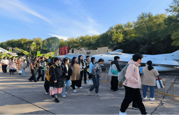 同学们首先参观了室外展区,多种型号的战机、导弹及其他空军装备排列整齐,彰显着祖国空军雄厚实力。大家认真观看指示牌的讲解,详细了解了每一架飞机背后的故事,仿佛穿越时光,见证了中国航空事业从无到有、从弱到强的发展历程。
