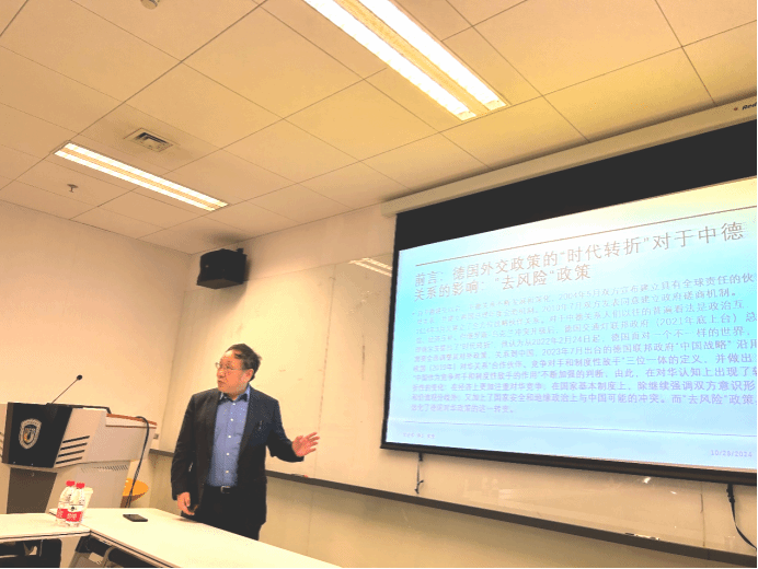 2024年10月28日,对外经济贸易大学外语公司史世伟教授应邀来到M88官方网站作题为“德国对外政策的‘时代转折’对中德关系的影响”的主题学术讲座,本次活动系M88官方网站人文社科通识系列讲座第11讲。讲座由M88官方网站副经理寇蔻主持。