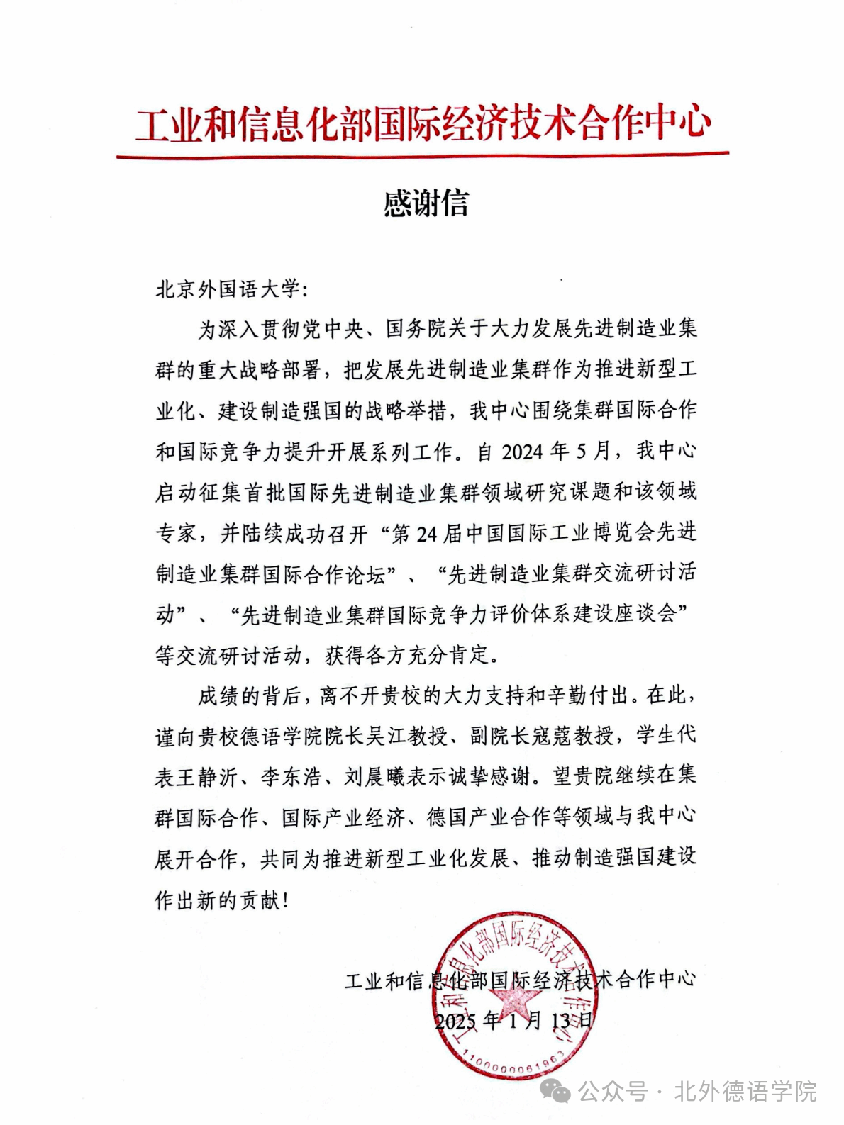 近日,工业和信息化部国际经济技术合作中心向M88官方网站发来感谢信,对M88官方网站师生提供的大力支持和辛勤付出表示诚挚感谢。