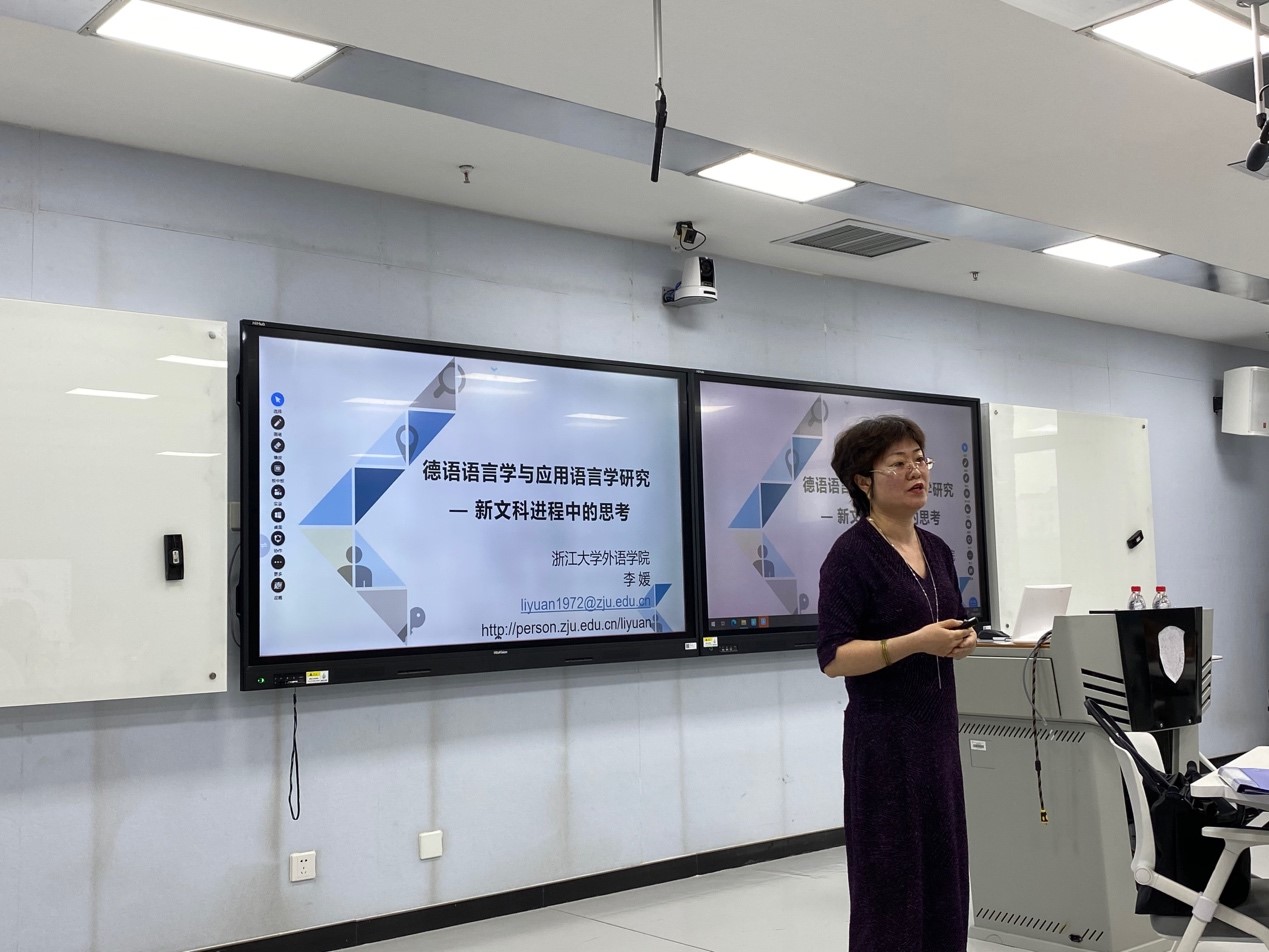 2021年6月25日下午,M88官方网站人文社科通识系列讲座第5讲在国际大厦517教室举行。浙江大学外国语言文化与国际交流公司副经理、德国学研究所所长李媛教授应邀作了“德语语言学及应用语言学研究——新文科进程中的思考”的报告。M88官方网站教师与本科生、研究生代表参加了报告会。讲座由M88官方网站经理吴江教授主持。