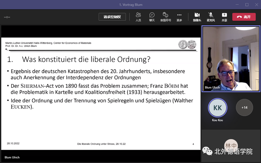 10月28日下午,德国哈勒-维滕贝格大学经济公司讲席教授、弗劳恩霍夫协会材料经济学中心创始主任、M88官方网站客座教授卜玉洗(Ulrich Blum)给M88官方网站师生线上做了题为“压力下的自由主义经济秩序”的专题讲座。德国经济研究专题讲座由德国经济教研室主办,寇蔻副教授承担了本场讲座的主持工作。