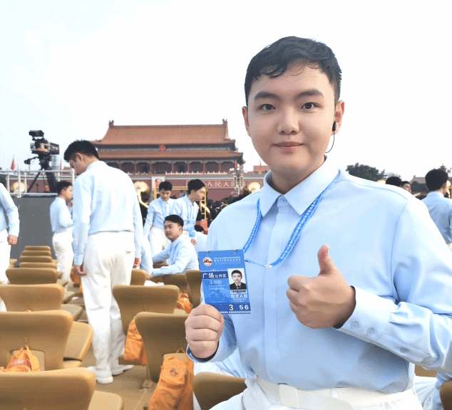 我也遇到过许多困难,这其中最难的就是身体素质上的挑战。这其中既有在军营同军乐团在烈日当空的午后合练,也有在天安门广场披星戴月的三次综合演练。但是当我真正站在天安门广场上时,我真心体会到这些付出都是值得的。站在祖国的心房,聆听礼炮惊天动地的回响,以及国旗护卫队整齐的踏步声,口号声,将军刀齐刷刷立起时的金属撞击声,亲眼见证一件件大国重器的雄姿,我心潮澎湃。生逢其时,何其有幸。“歌唱我们亲爱的祖国,从今走向繁荣富强!”随着《歌唱祖国》最后一句歌词结束,此次纪念大会四个多月来的准备就此告一段落,但“请党放心,强国有我”青春誓言,将和这段宝贵的经历一起久久地铭刻在我的心中。